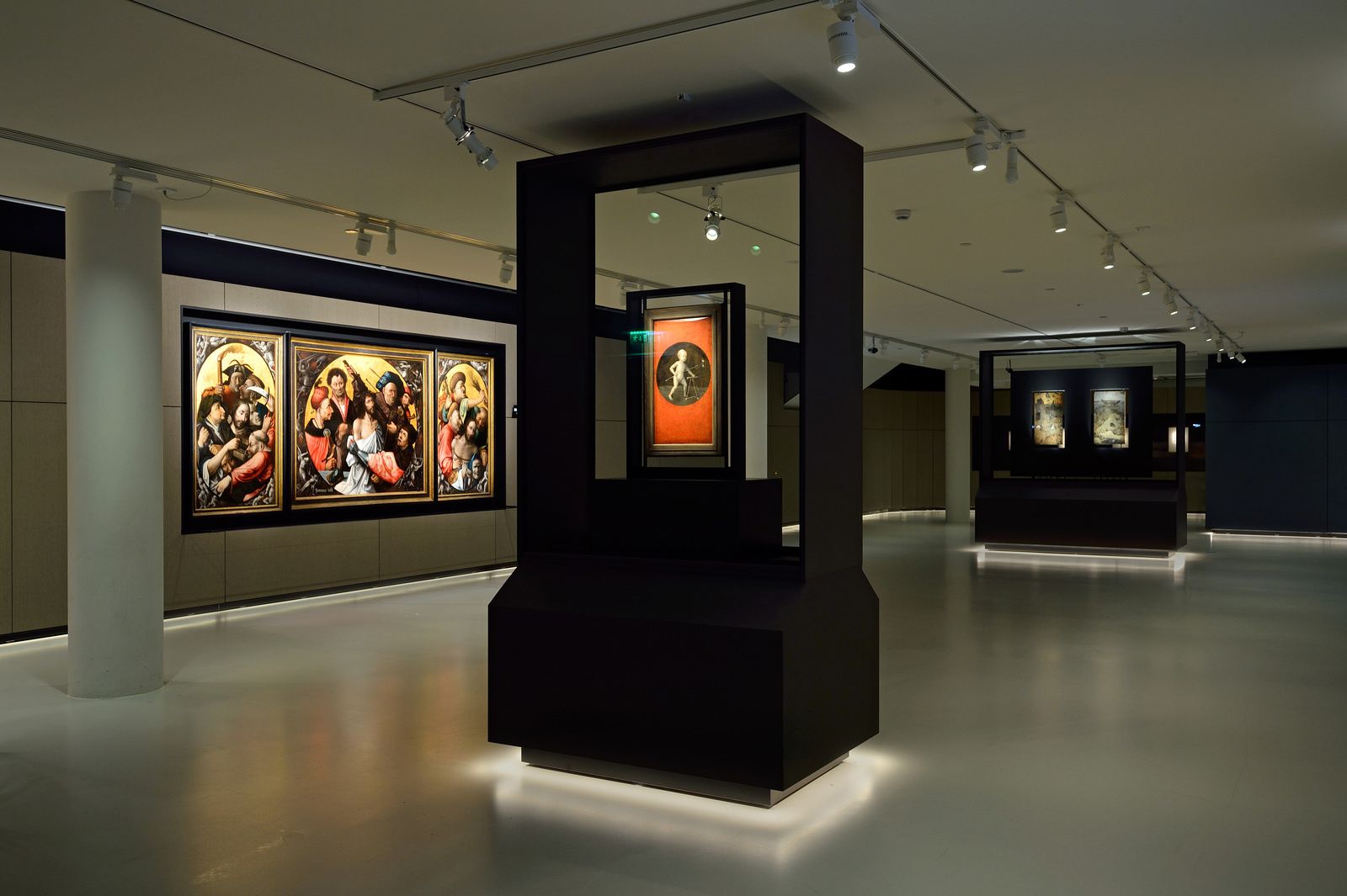 À gauche suiveur de Jérôme Bosch, L'Arrestation, le Couronnement d'épines et la Flagellation du Christ, 1530-1540 panneau central & 1540-1550 volets. Huile sur bois. Valence, Museo de Bella Artes de Valencia & au milieu Jérôme Bosch, Jésus apprenant à marcher, face extérieure de Le Portement de croix, vers 1490-1510. Huile sur bois, 59,7 x 32 cm. Vienne, Kunsthitorisches Museum, Gemäldegalerie Vue d'ambiance de l'exposition Jérôme Bosch. Visions de génie © Foto Mike Brink