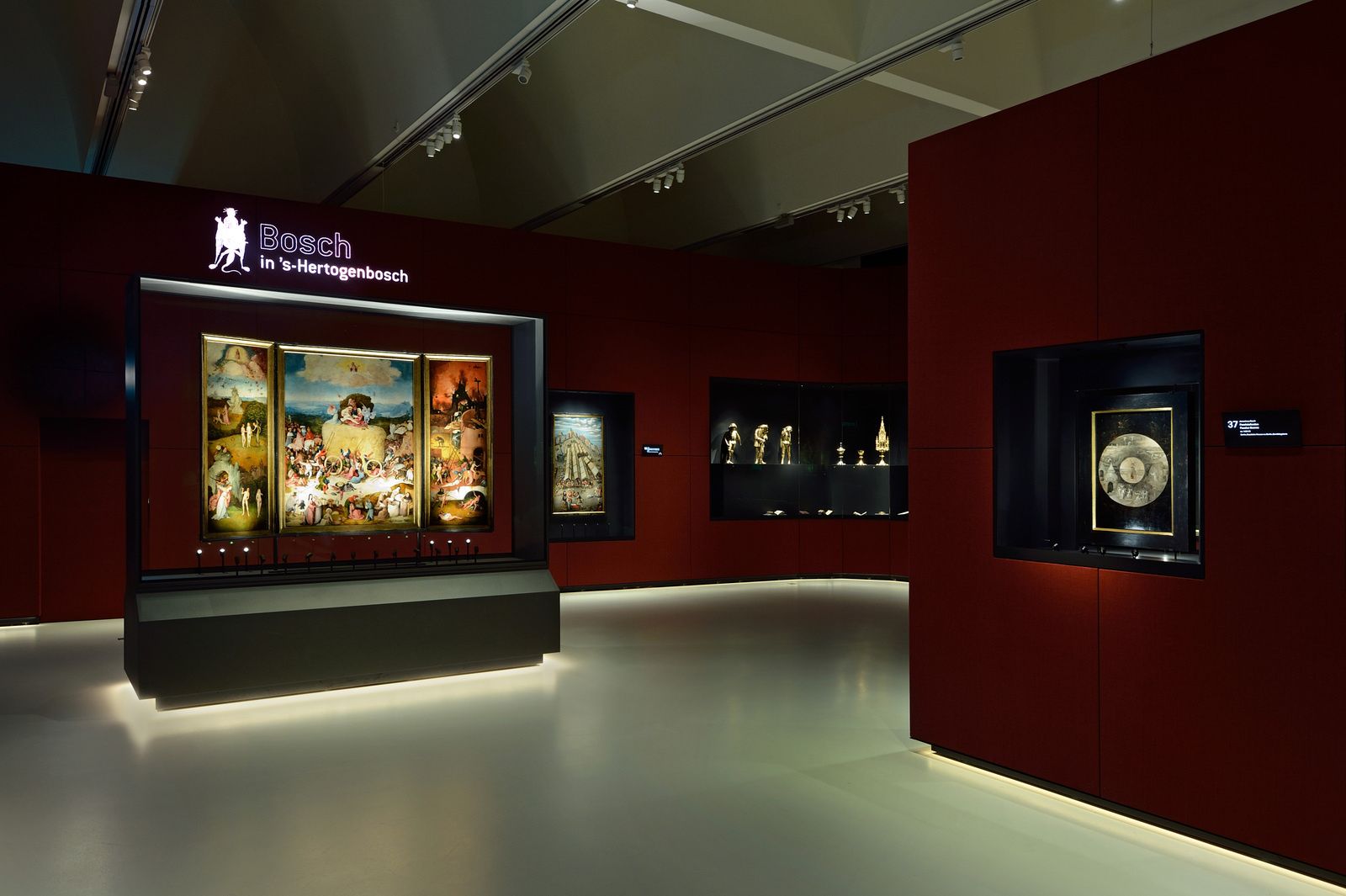 Douze de ses peintures ont été spécialement restaurées à cette occasion http://www.lecurieuxdesarts.fr/2016/03/les-tableaux-venitiens-de-jheronimus-bosch. Cent trois numéros en tout, présentées en 6 cheminements, Le pélerinage de vie avec le triptyque du Chariot de foin (1510-1516), Bosch à Bois-le-Duc avec Saint Jean-Baptiste (1490-1495), La vie du Christ avec Le portement de croix (1490-1510), Les dessins, Les saints avec Tryptique des ermites (1495-1505) et La fin des temps avec Le Jugement dernier (1495-1505). Présentation plongée dans la pénombre faisant surgir dans la lumière les œuvres présentées. L'exposition comprend aussi ses suiveurs, des peintures de son atelier.