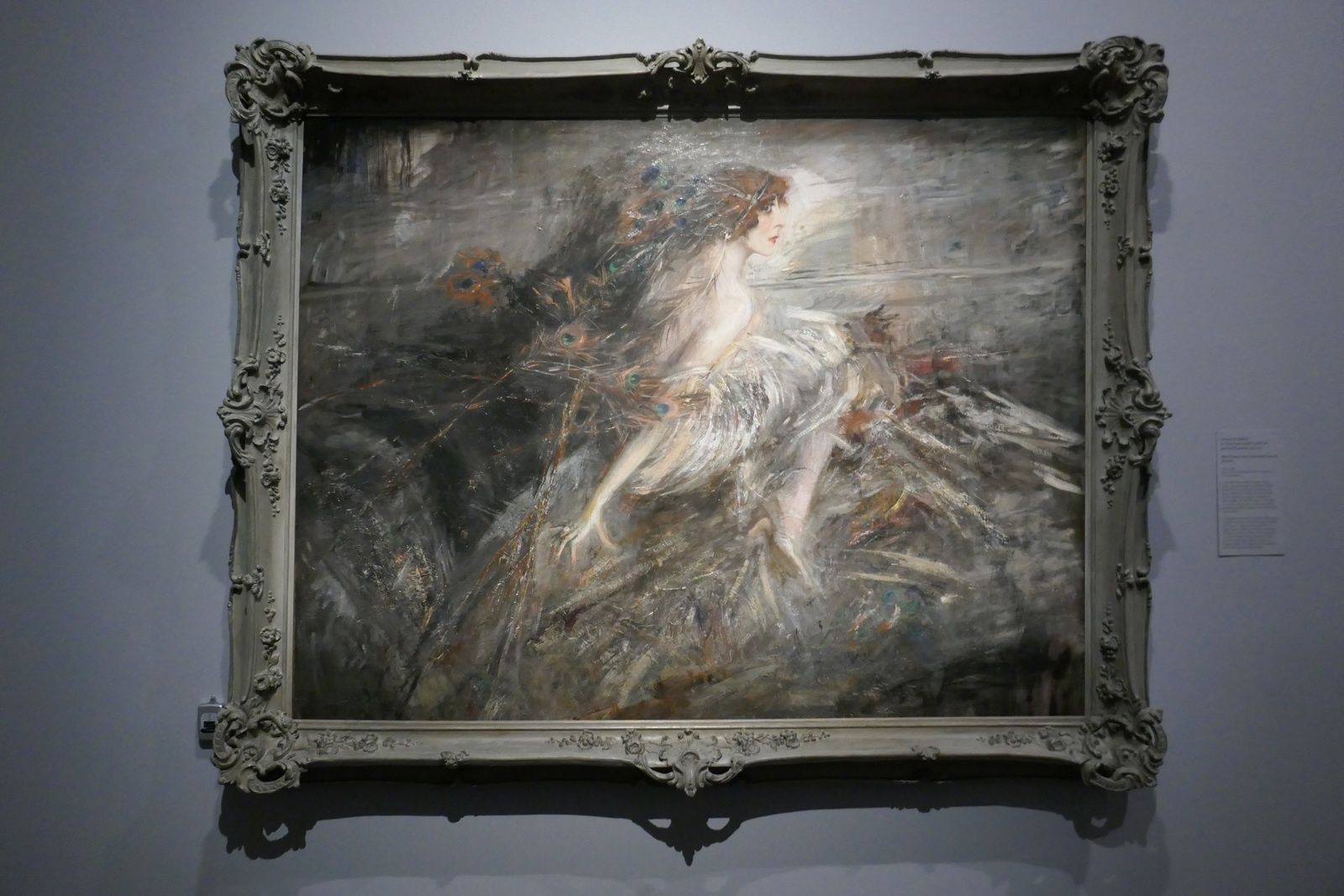 Giovanni Boldini, La marquise Luisa Casati avec des plumes de paon, vers 1911-1913. Huile sur toile, 130 x 176 cm.. Roma, Gallerie Nazionale d'Arte Moderna e Contemporanea. Photo Le Curieux des arts Gilles Kraemer, exposition Boldini e la moda, Ferrare. Février 2019.