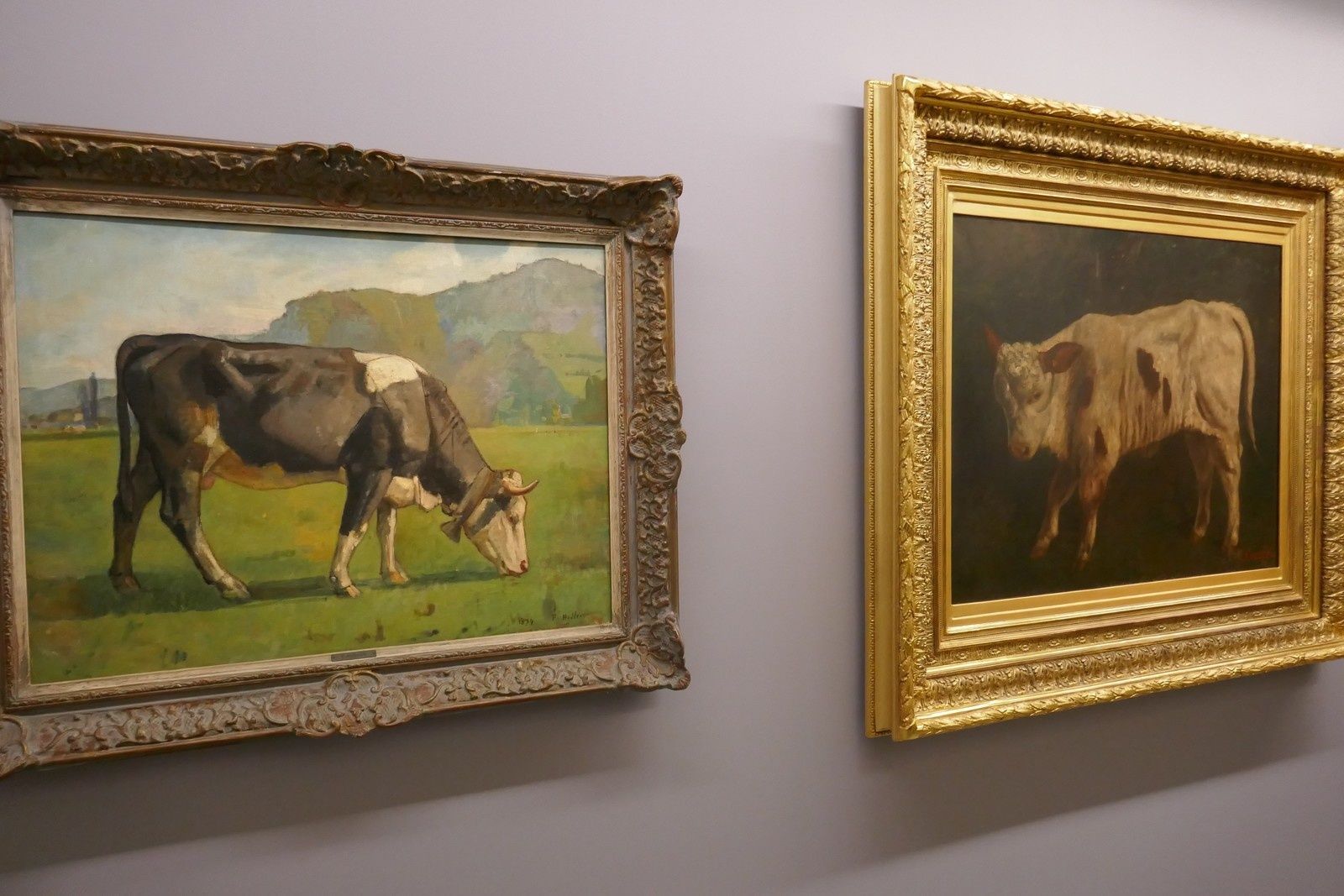 Ferdinand Hodler, La Vache dans la prairie, vers 1887. Huile sur toile. 70 x 92 cm.. Collection privée // Gustave Courbet, Le veau, 1872-1873. Huile sur toile. 88 x 116 cm.. Ornans, Musée Gustave Courbet © photo Le Curieux des arts Gilles Kraemer, 2019.