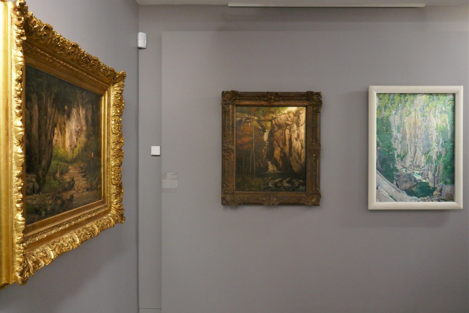 À gauche Gustave Courbet, Le Gour de Conche, 1864. Huile sur toile. 74 x 60 cm.. Besançon, Musée des Beaux-Arts et d’Archéologie. À droite Ferdinand Hodler, Les Gorges de la Sarine, 1907. Huile sur toile. 91 x 68 cm.. Collection Christoph Blocher © photo Le Curieux des arts Gilles Kraemer, 2019.